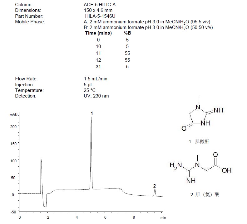 針對不同酸堿性的化合物,ACE設計了三款HILIC柱(A,B和N),實現不同的選擇性。比如:
