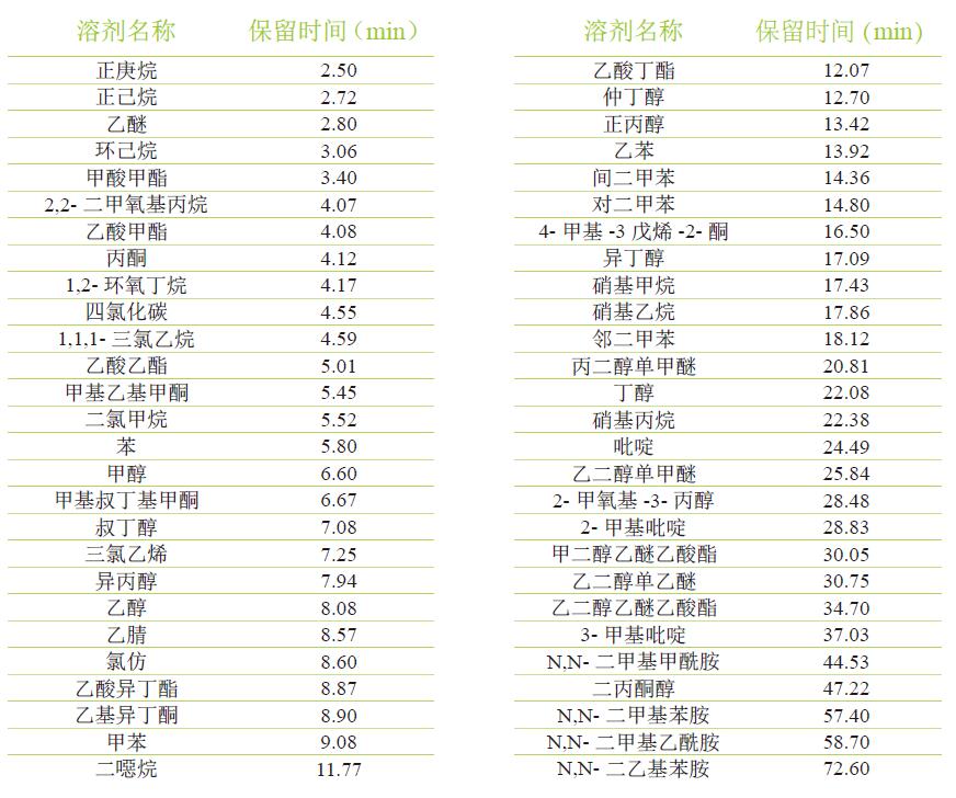 54 種溶劑保留時(shí)間列表