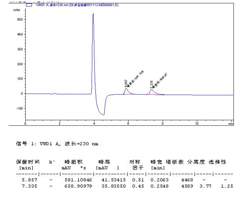 色譜柱:Chiral MZ(2) 5μm 250×4.6 mm 貨號:FMG-AC5-B02-NFC 流速:0.8mL/min 檢測:UV230nm 樣品濃度:1 mg/mL 進樣量:2 μ 流動相:咨詢