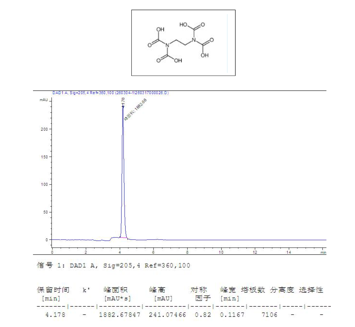 App ID: FLM-T260001 Titank C18 柱對(duì)EDTA 的檢測(cè) 方法:自定 色譜柱:Titank C18 5μ 250×4.6mm 貨號(hào):FMG-5560-EONU 流速:1 mL/min 檢測(cè):UV205nm 樣品濃度:1 mg/mL,溶劑:水,進(jìn)樣量:2 μ 流動(dòng)相:0.1%磷酸水溶液 色譜圖: 說明:EDTA 作為藥物輔料中常見成分,Titank C18 雜化硅膠固定相,可在純水相條件下實(shí)現(xiàn)快速分析, 柱效良好。 ![]() |